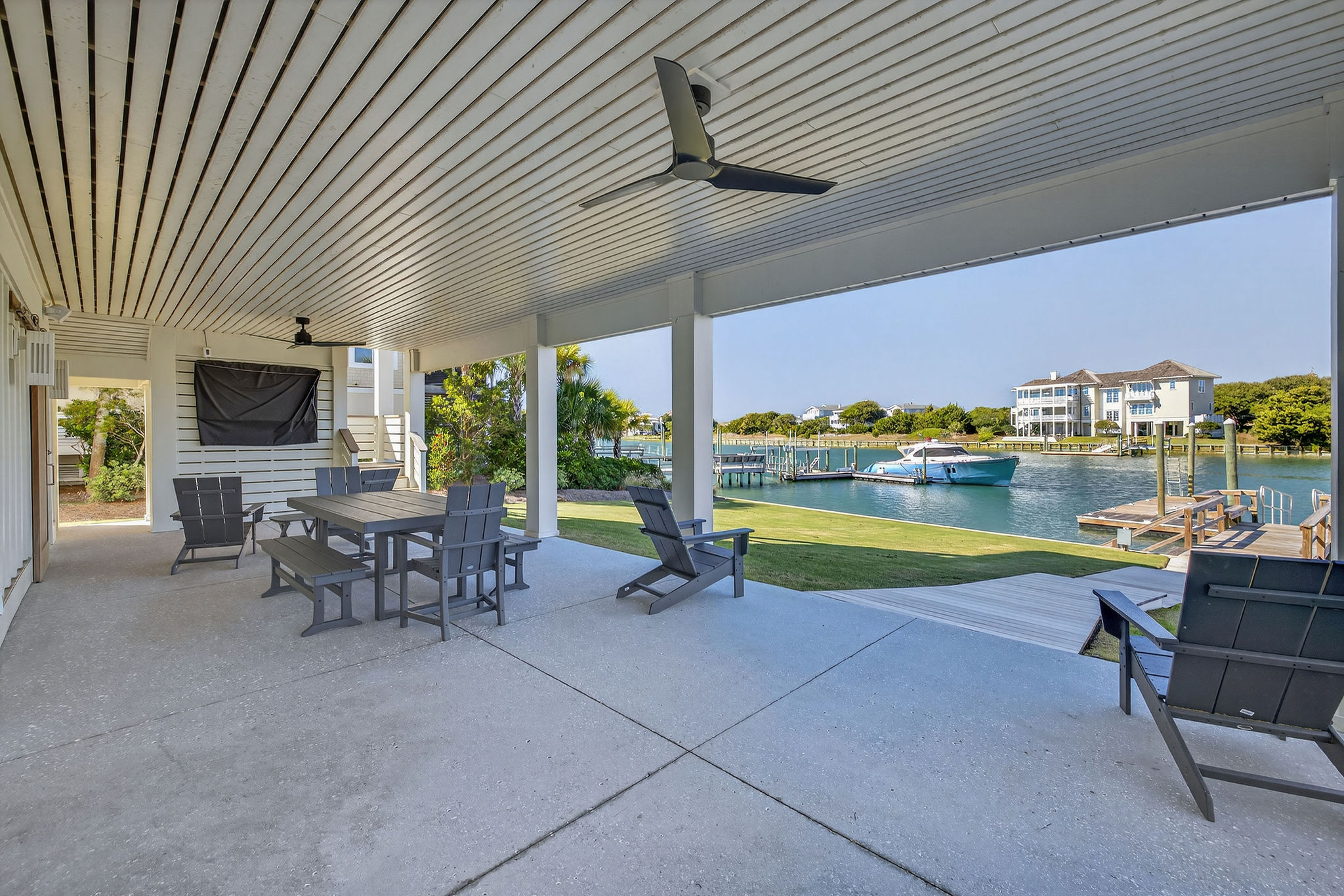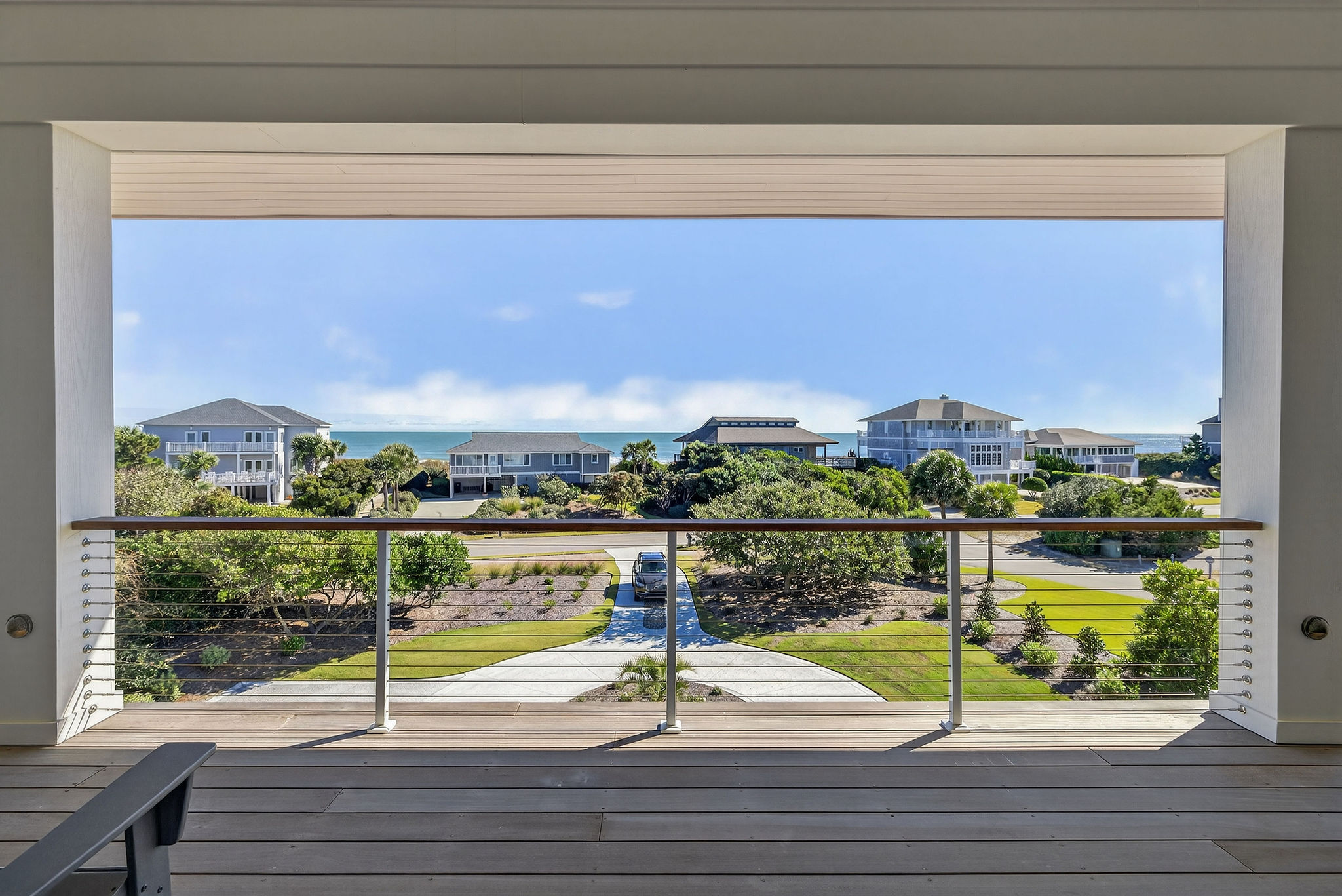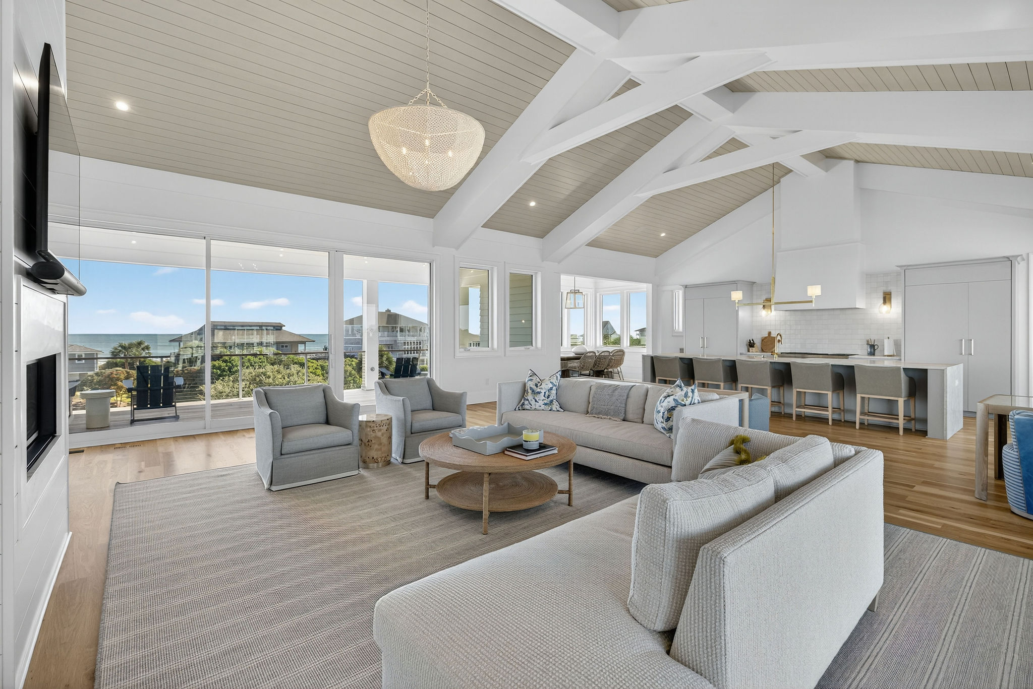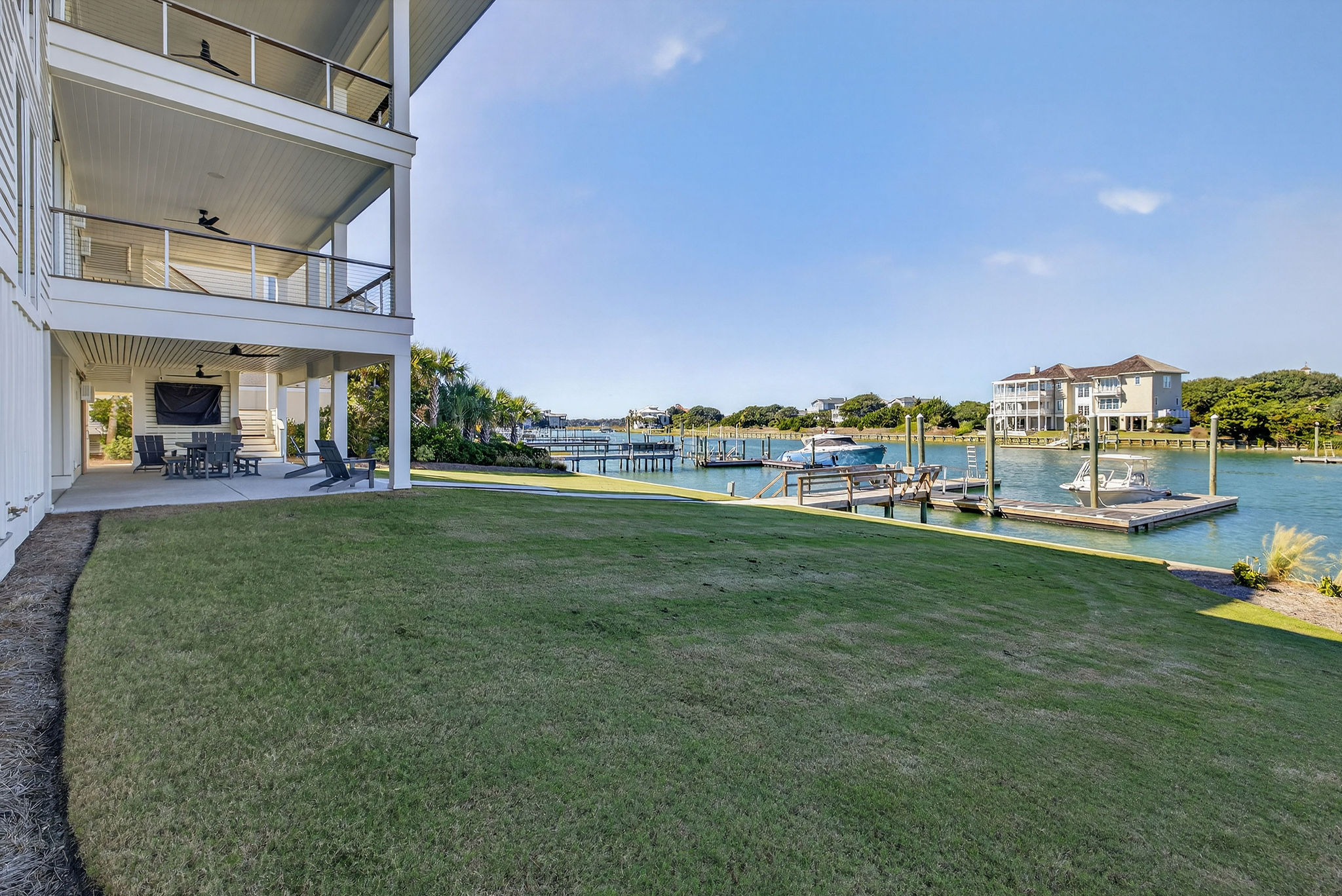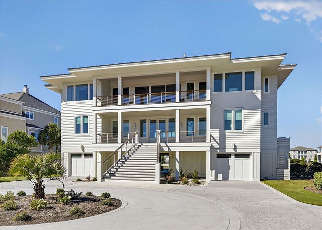 5BR/5.5BA Sound front, brand new construction. Upper Level has open living, dining and kitchen, butler's pantry, powder room, Master Bedroom (King) with private en suite bath. Second living level offers a TV den, 4 Bedrooms (King, King, 2 Full beds, 2 Twins) each with private bath. The ground level offers a wet bar and large patio. This premier property has a private yard, plenty of deck space and a shared dock. Directly across street from ocean. Maximum 10Amenities
