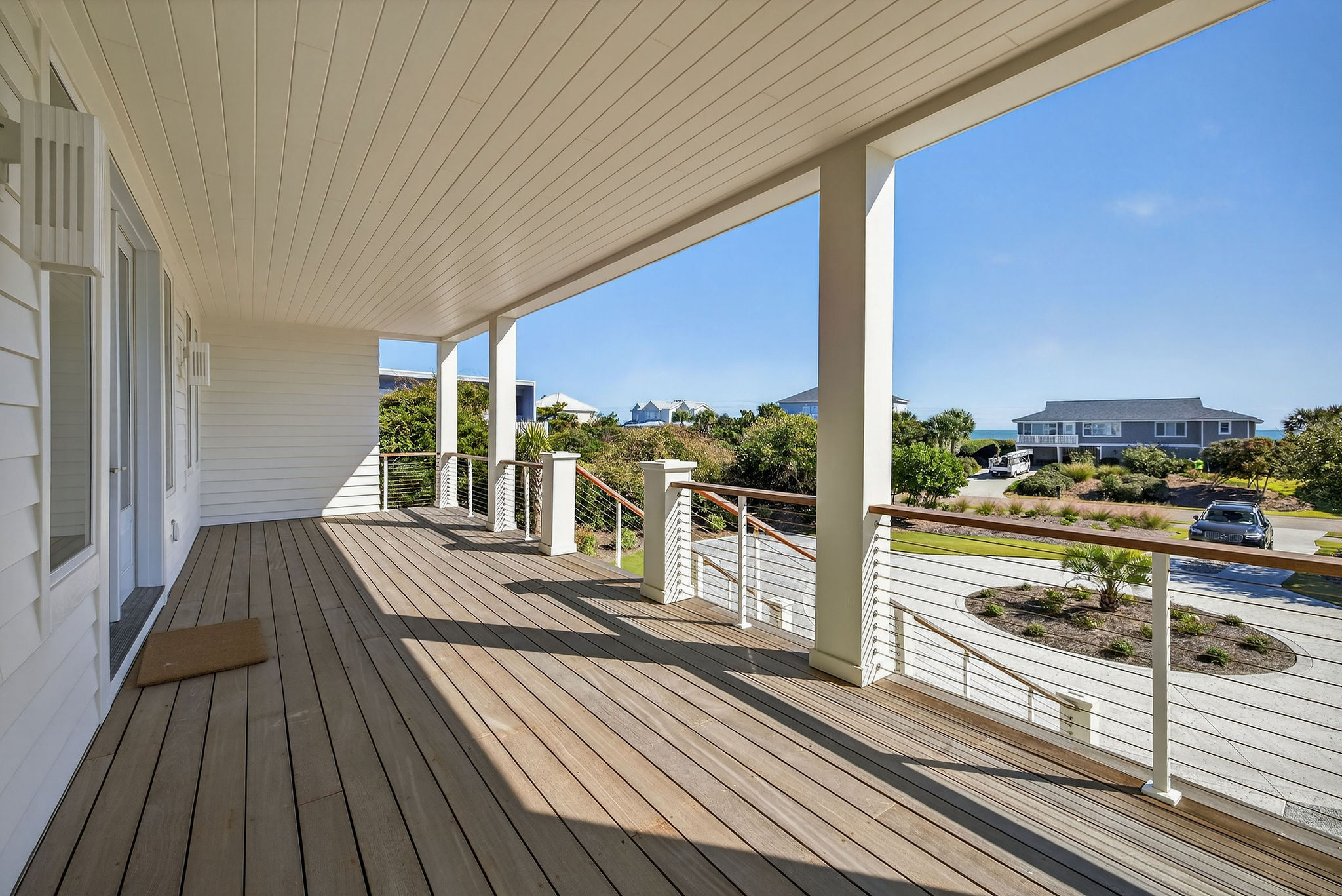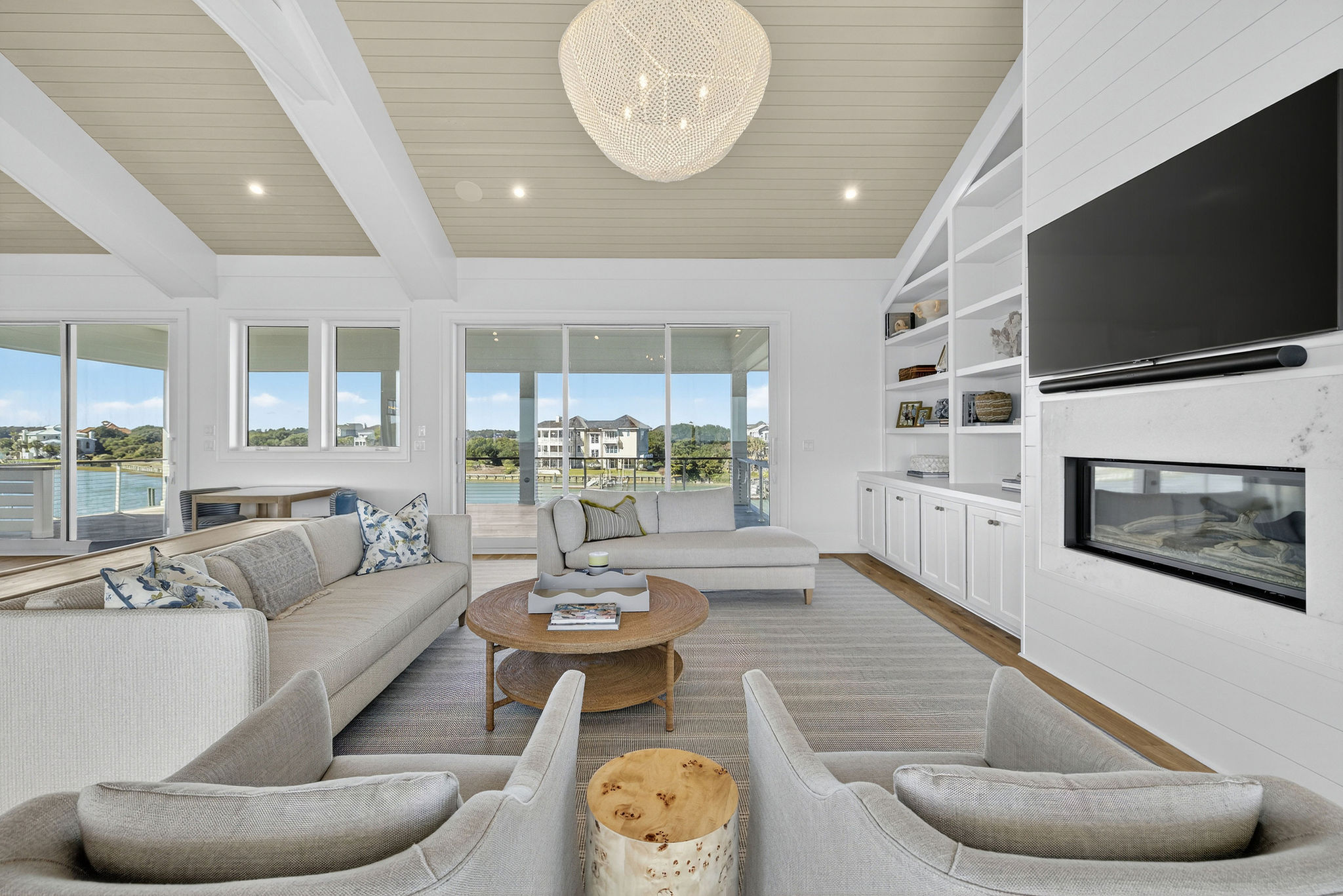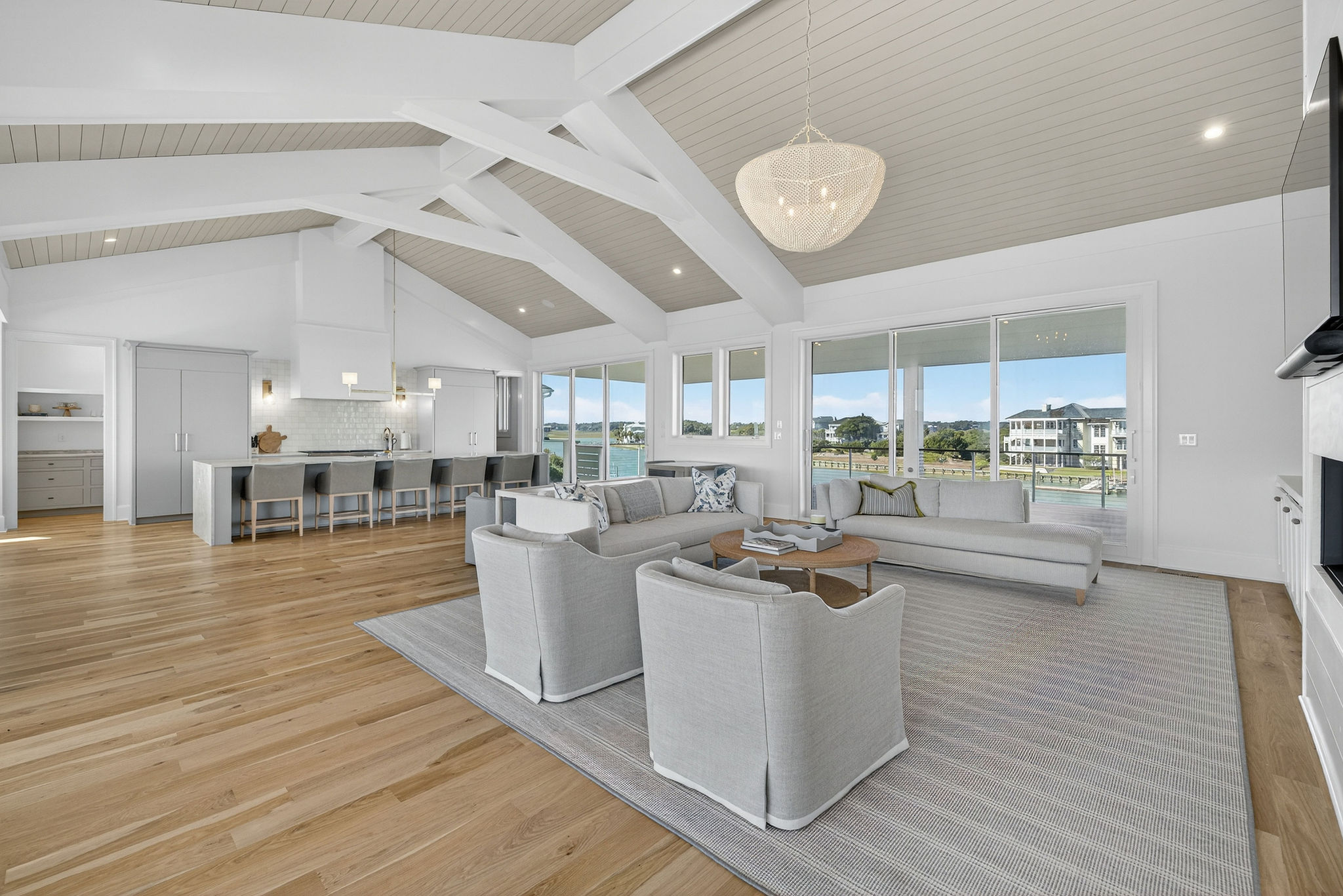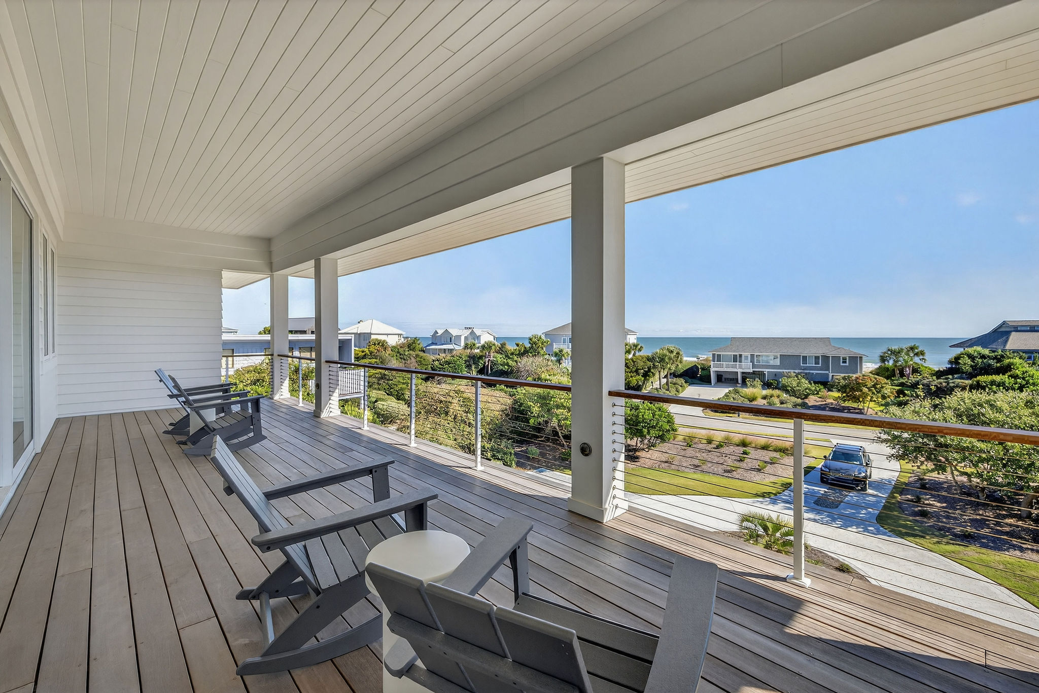 5BR/5.5BA Sound front, brand new construction. Upper Level has open living, dining and kitchen, butler's pantry, powder room, Master Bedroom (King) with private en suite bath. Second living level offers a TV den, 4 Bedrooms (King, King, 2 Full beds, 2 Twins) each with private bath. The ground level offers a wet bar and large patio. This premier property has a private yard, plenty of deck space and a shared dock. Directly across street from ocean. Maximum 10Amenities