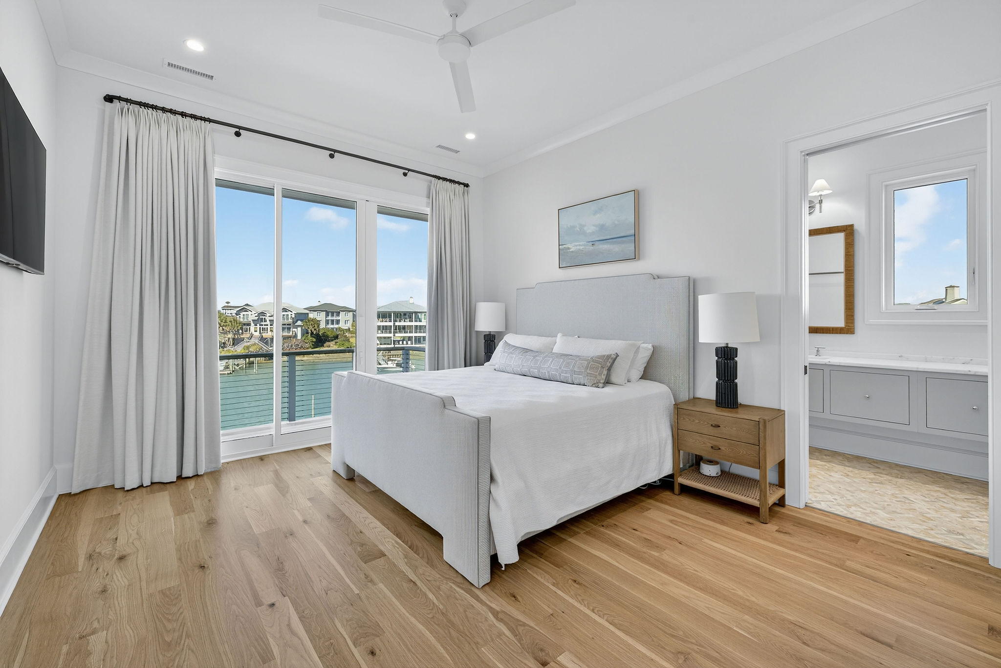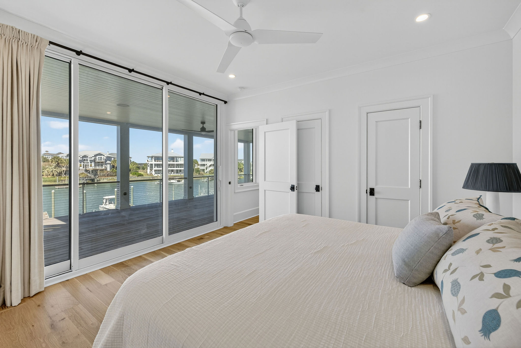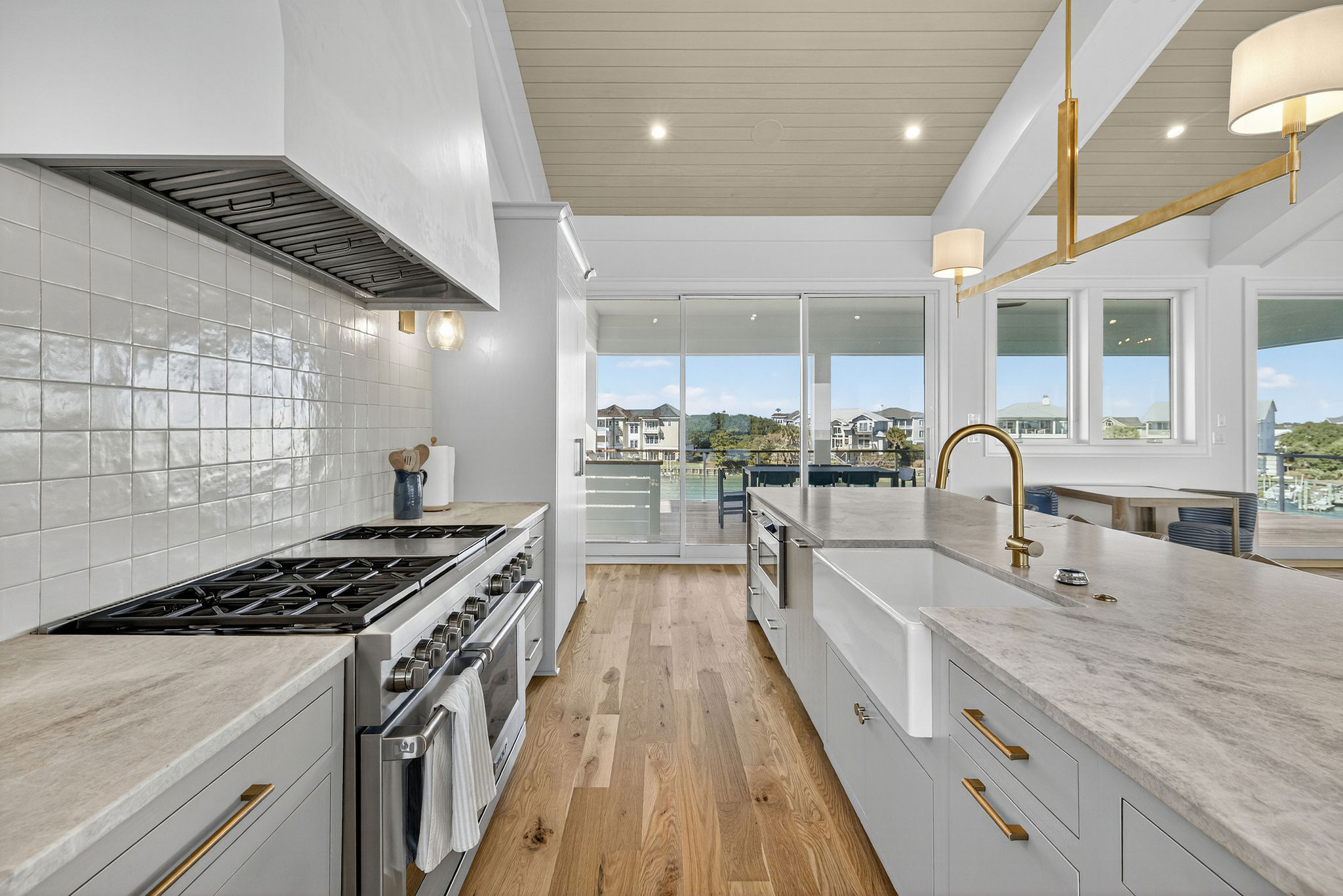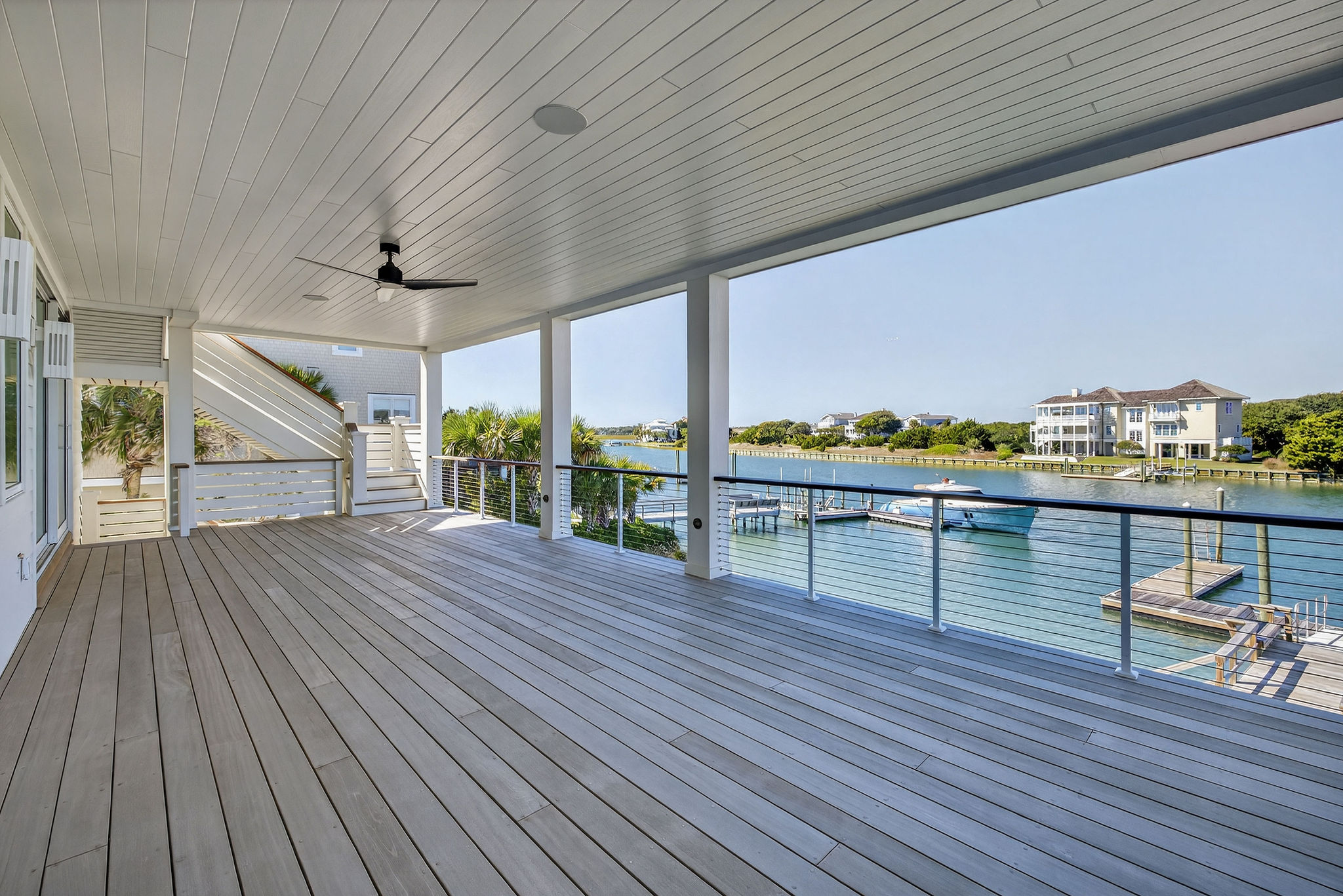 5BR/5.5BA Sound front, brand new construction. Upper Level has open living, dining and kitchen, butler's pantry, powder room, Master Bedroom (King) with private en suite bath. Second living level offers a TV den, 4 Bedrooms (King, King, 2 Full beds, 2 Twins) each with private bath. The ground level offers a wet bar and large patio. This premier property has a private yard, plenty of deck space and a shared dock. Directly across street from ocean. Maximum 10Amenities