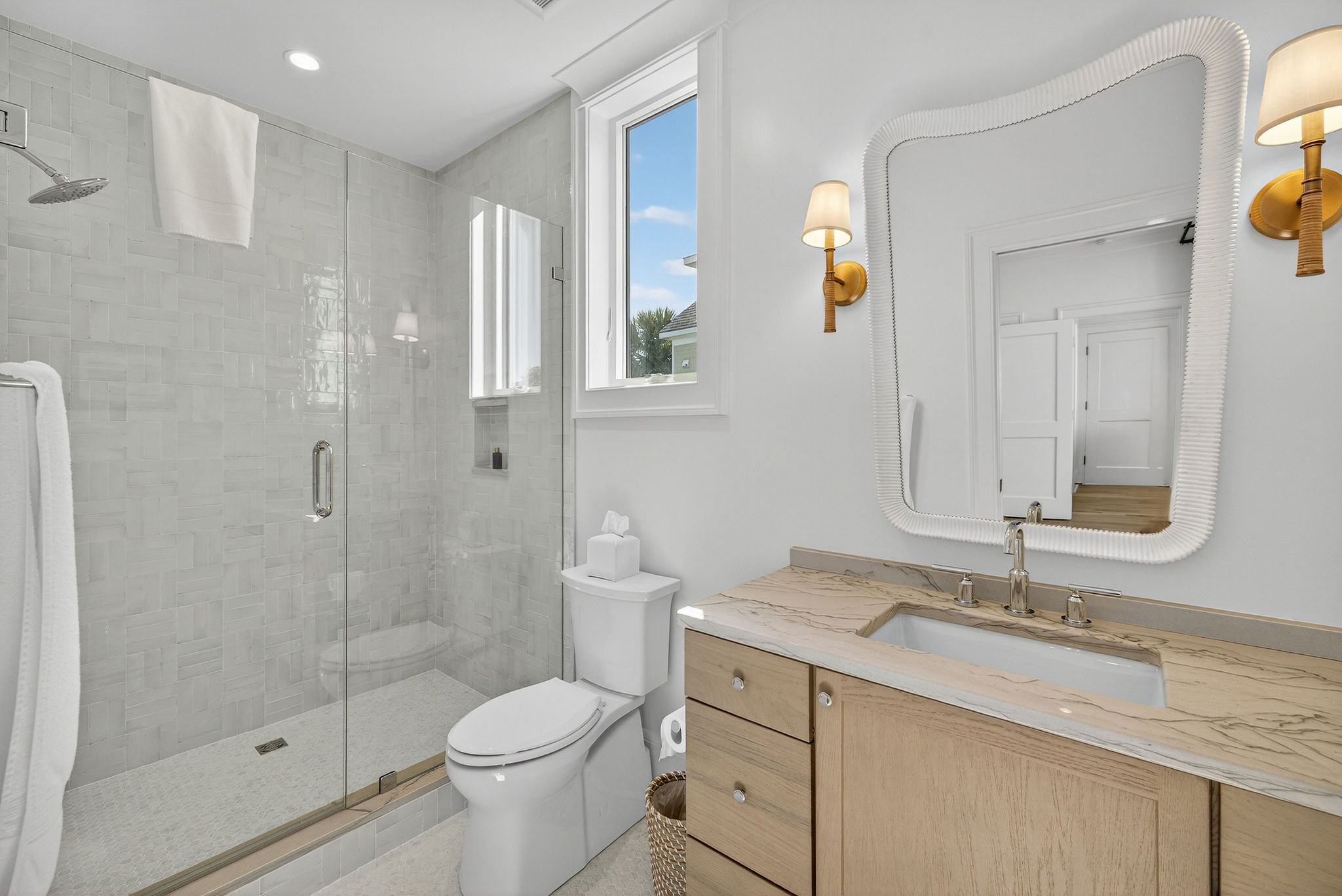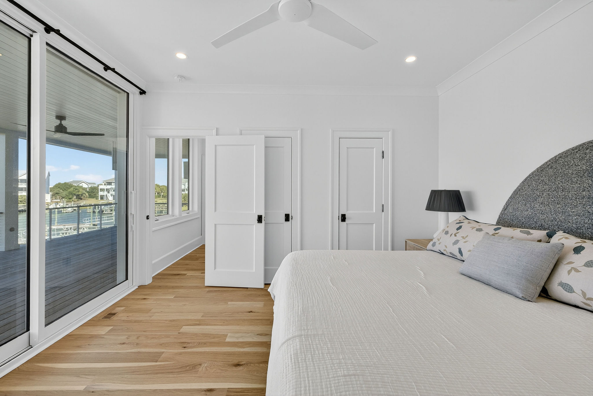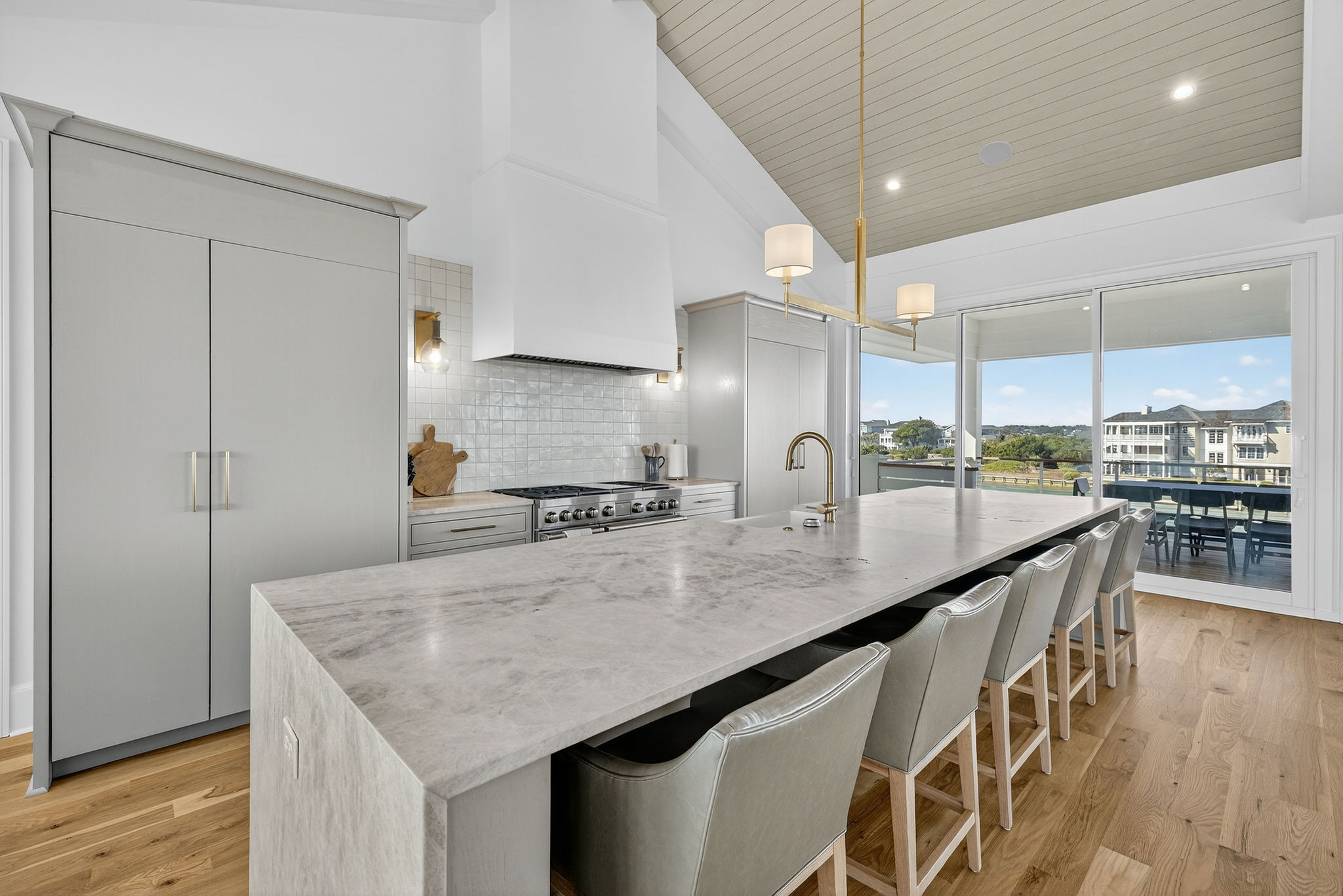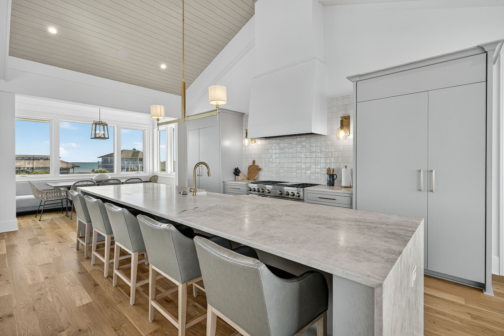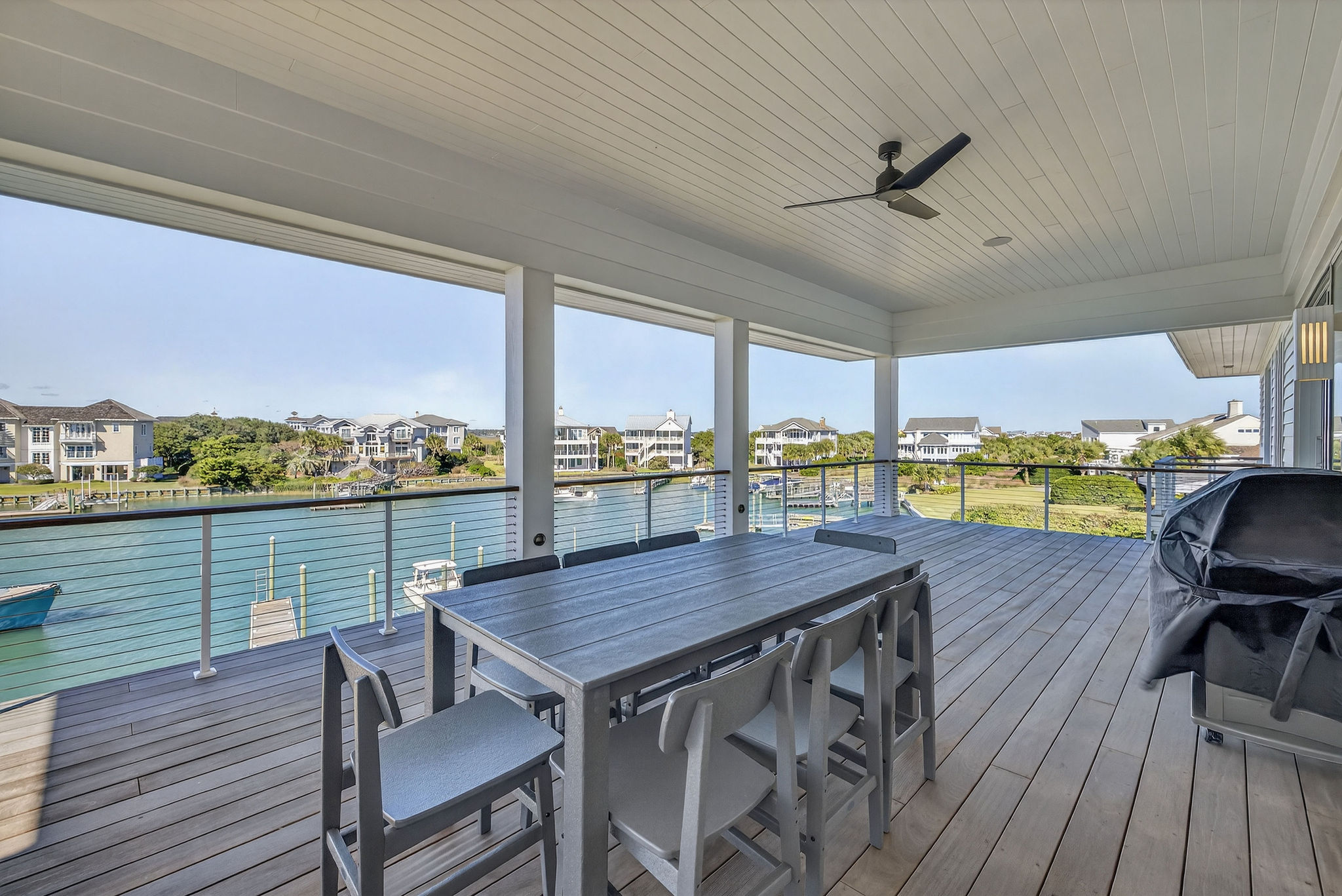 5BR/5.5BA Sound front, brand new construction. Upper Level has open living, dining and kitchen, butler's pantry, powder room, Master Bedroom (King) with private en suite bath. Second living level offers a TV den, 4 Bedrooms (King, King, 2 Full beds, 2 Twins) each with private bath. The ground level offers a wet bar and large patio. This premier property has a private yard, plenty of deck space and a shared dock. Directly across street from ocean. Maximum 10Amenities