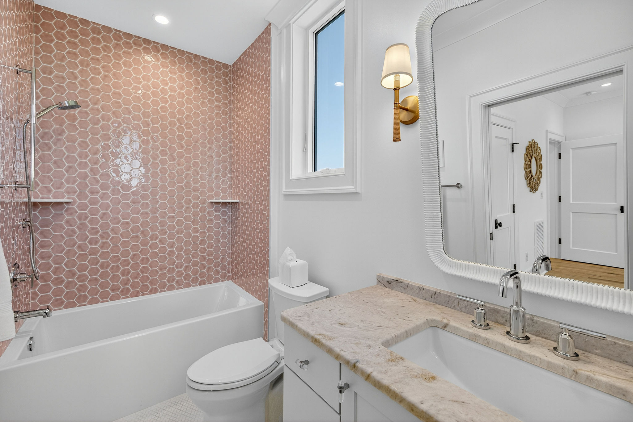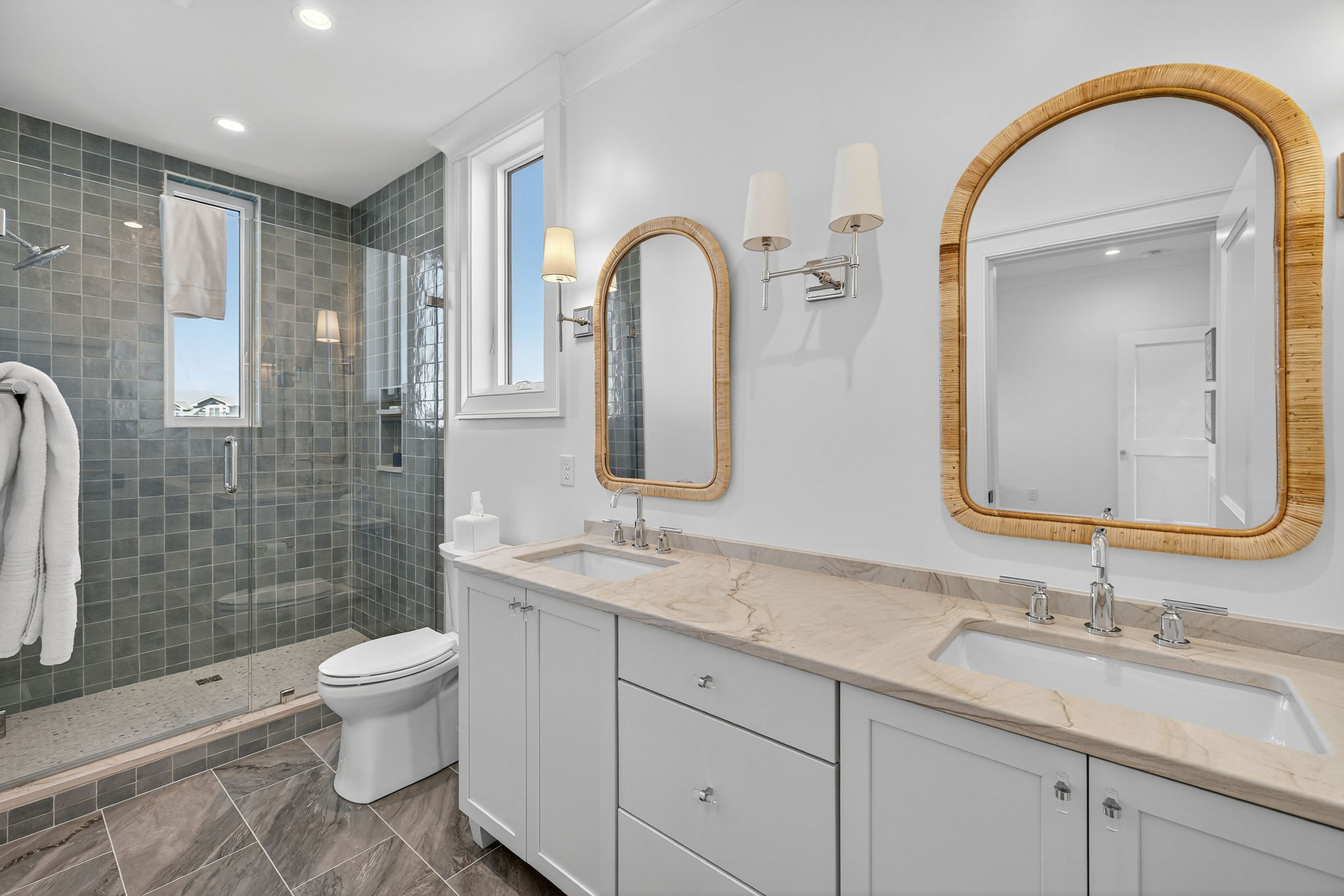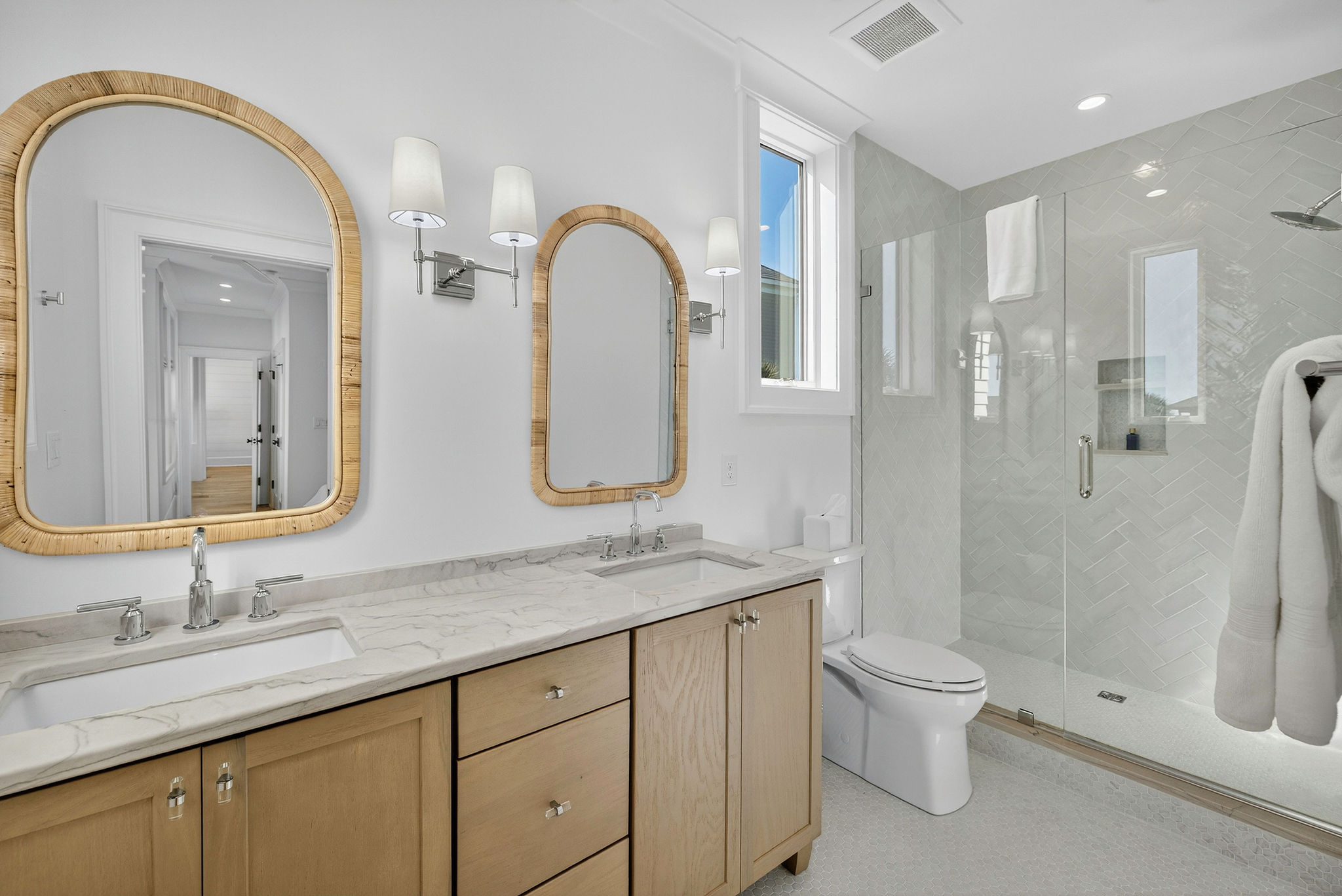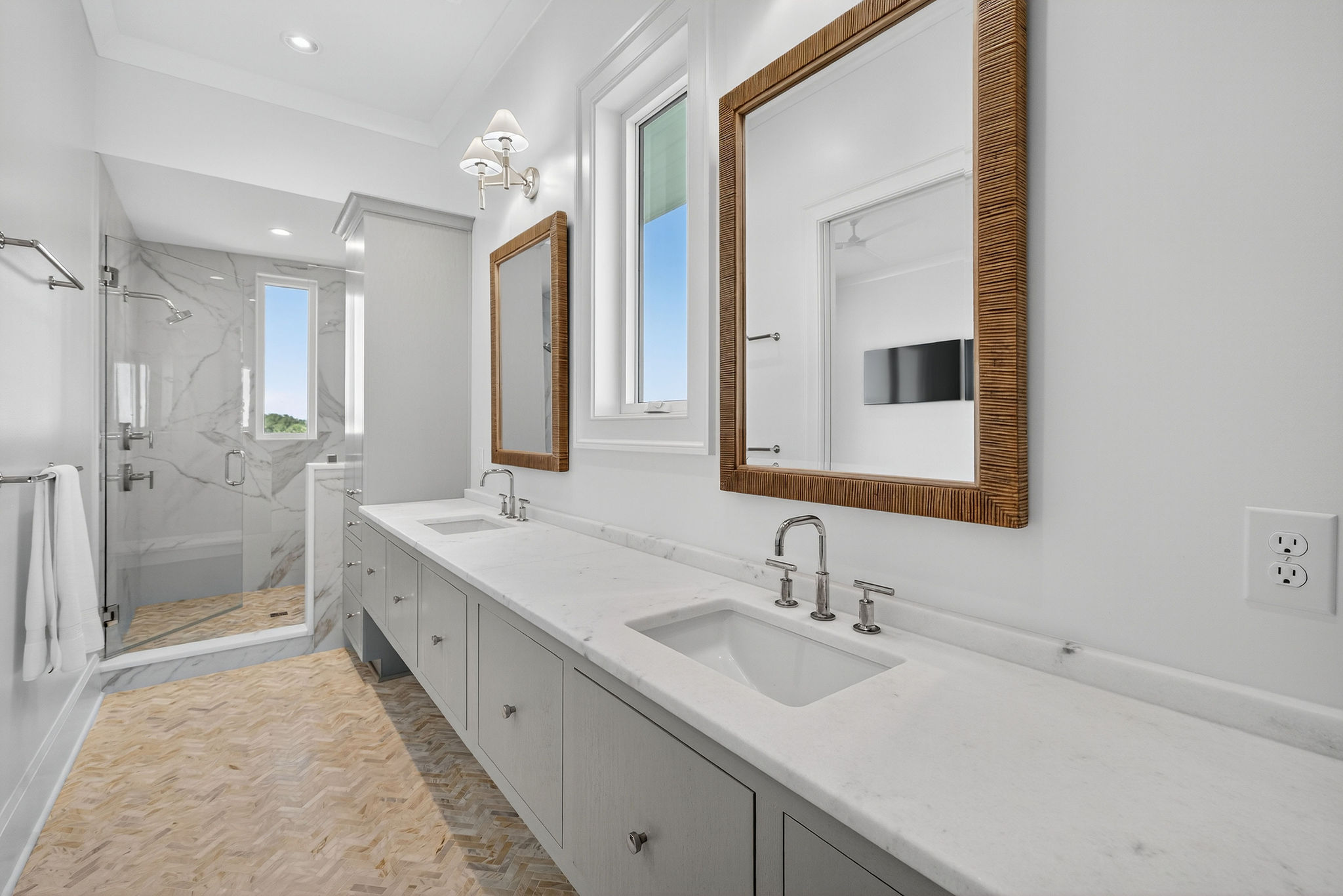 5BR/5.5BA Sound front, brand new construction. Upper Level has open living, dining and kitchen, butler's pantry, powder room, Master Bedroom (King) with private en suite bath. Second living level offers a TV den, 4 Bedrooms (King, King, 2 Full beds, 2 Twins) each with private bath. The ground level offers a wet bar and large patio. This premier property has a private yard, plenty of deck space and a shared dock. Directly across street from ocean. Maximum 10Amenities