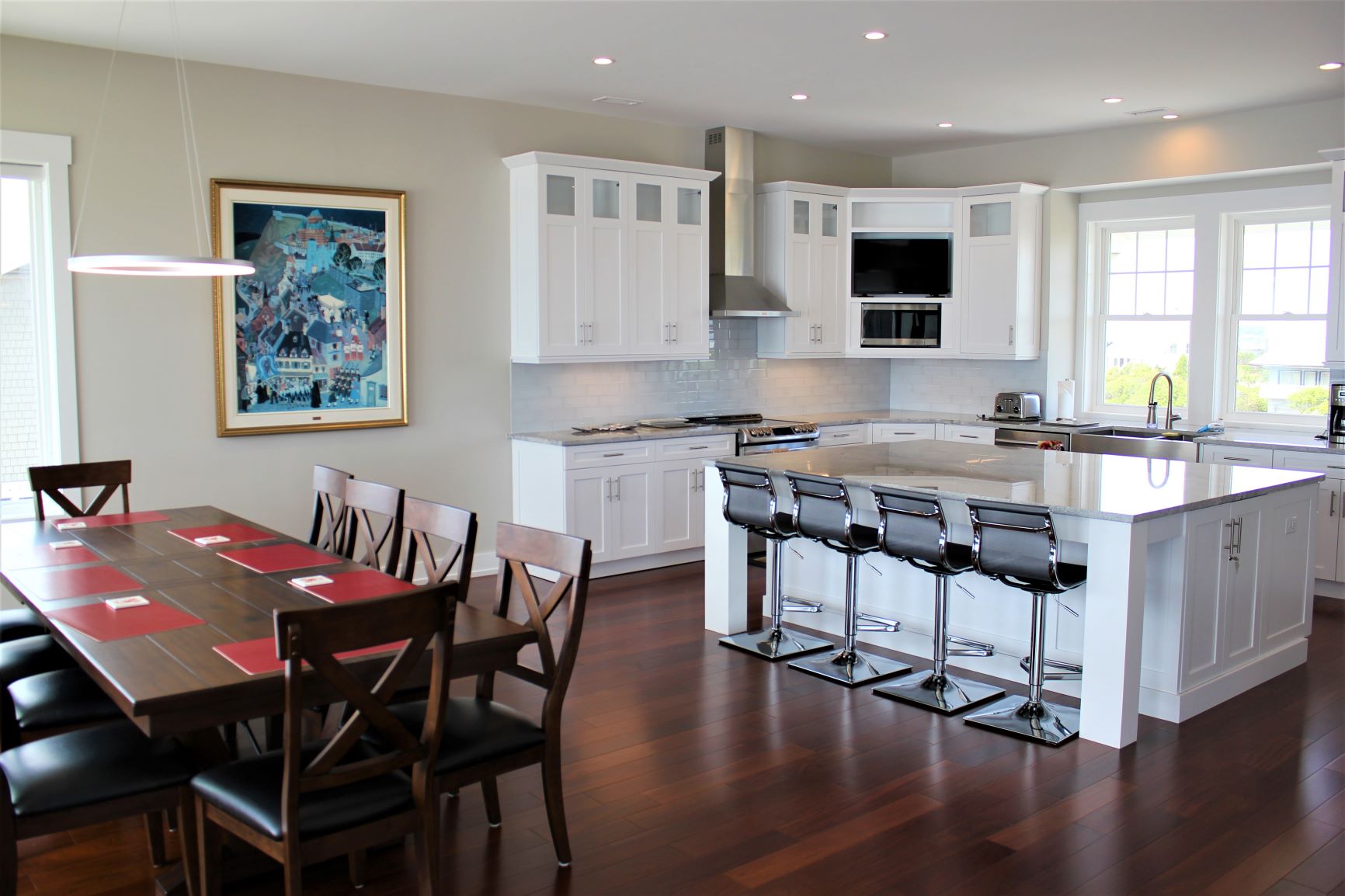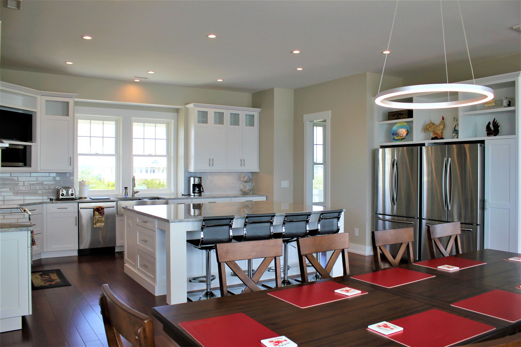 5 Bedrooms/5.5 baths First level has 4 bedrooms ( Bunk [queen/ extra long twin],3 Kings) and den. With 4 full baths. Main upper level has large open living/dining room, kitchen with two fridges and half bath. Along with the Master bedroom (King) with private bath. This houses does not have adequate parking for trailering a boat. Maximum 10Amenities