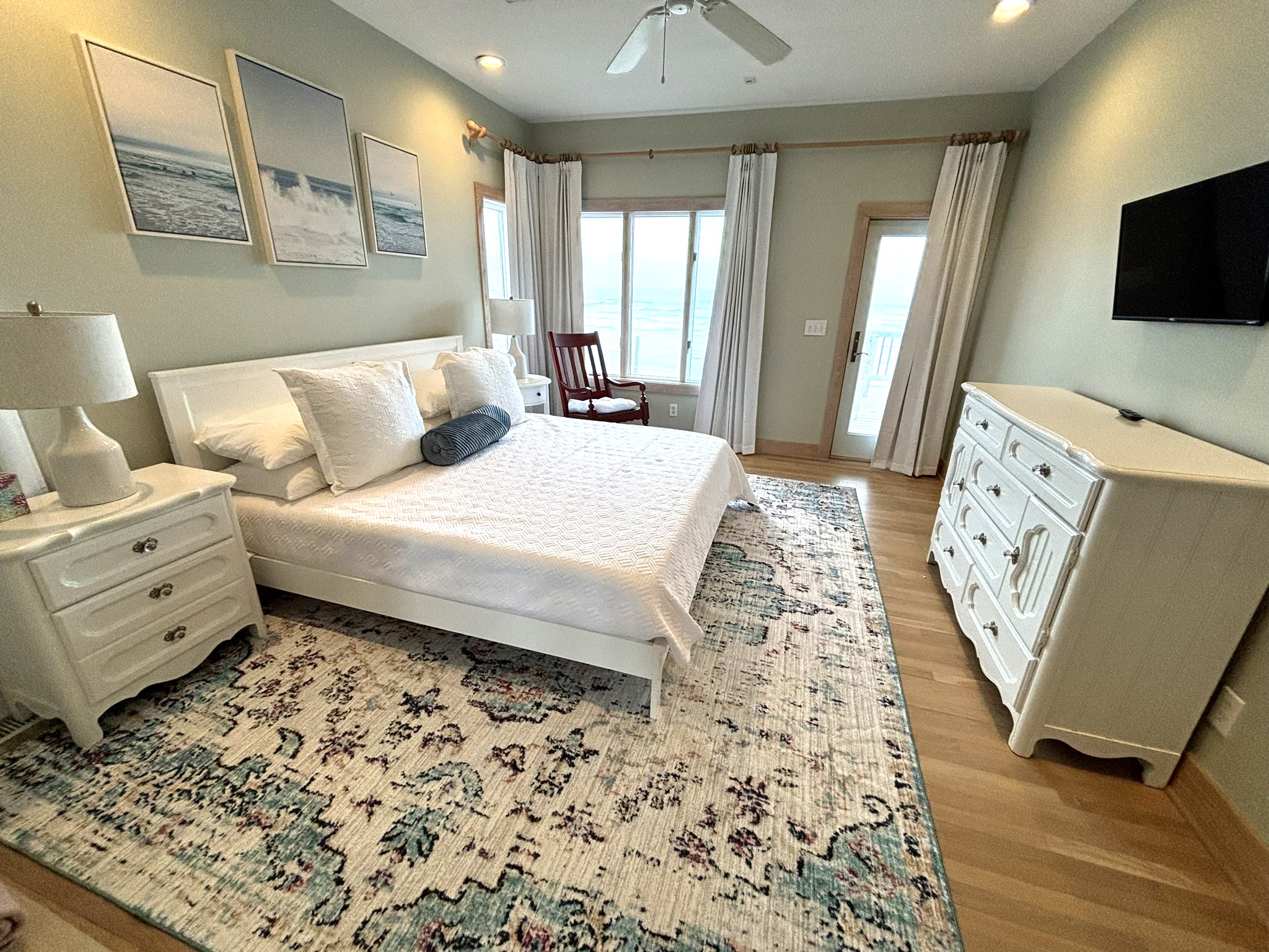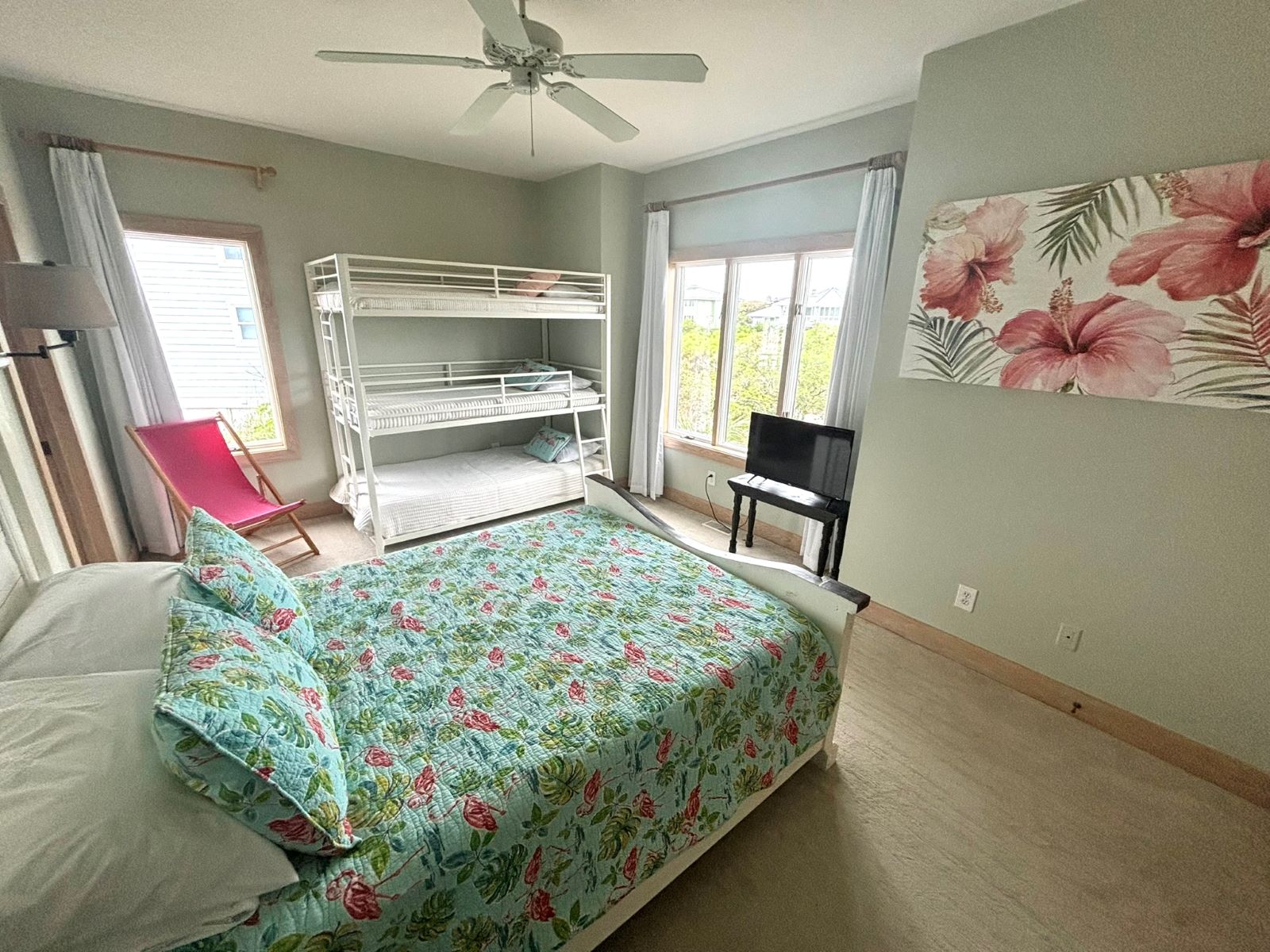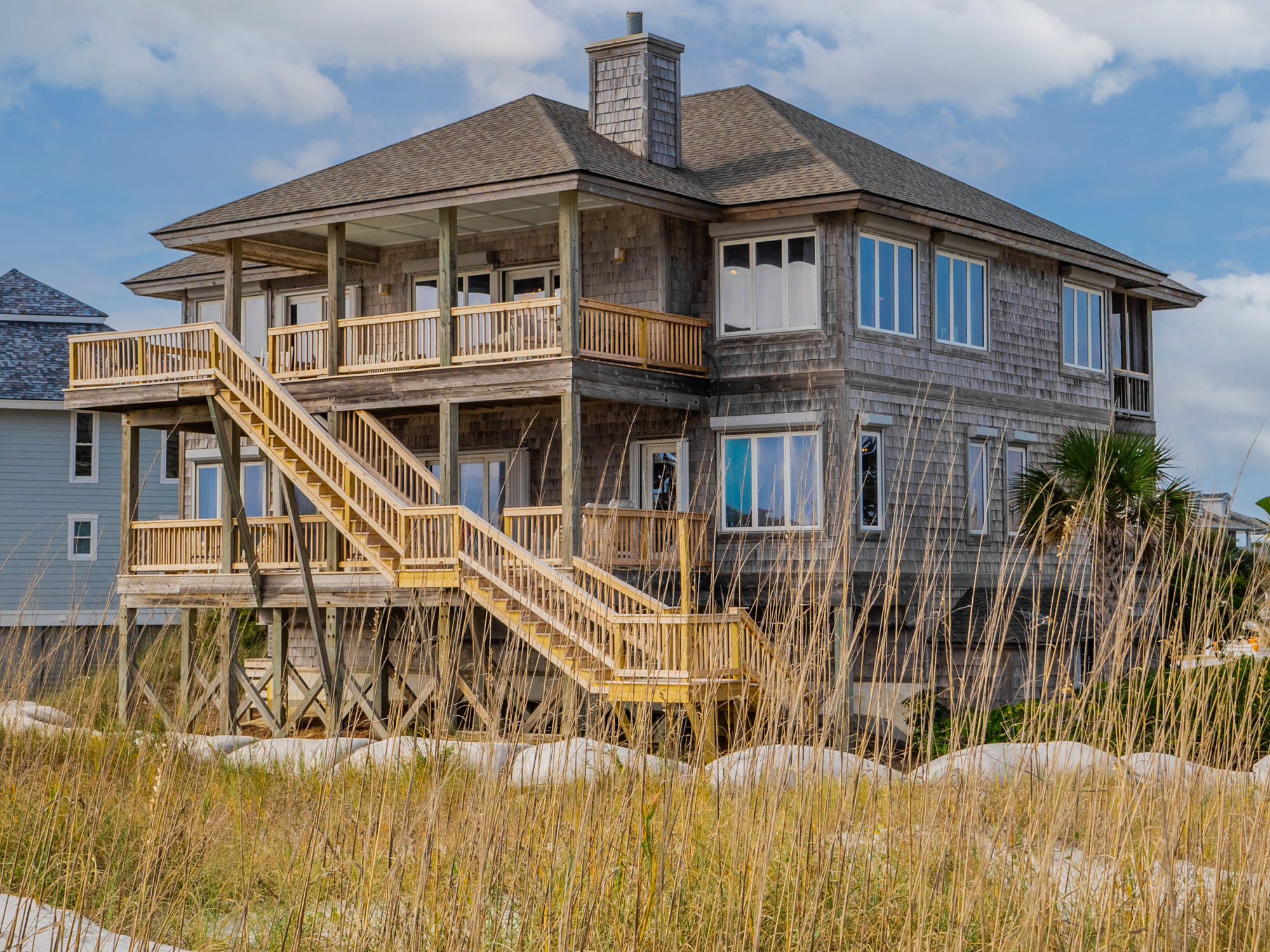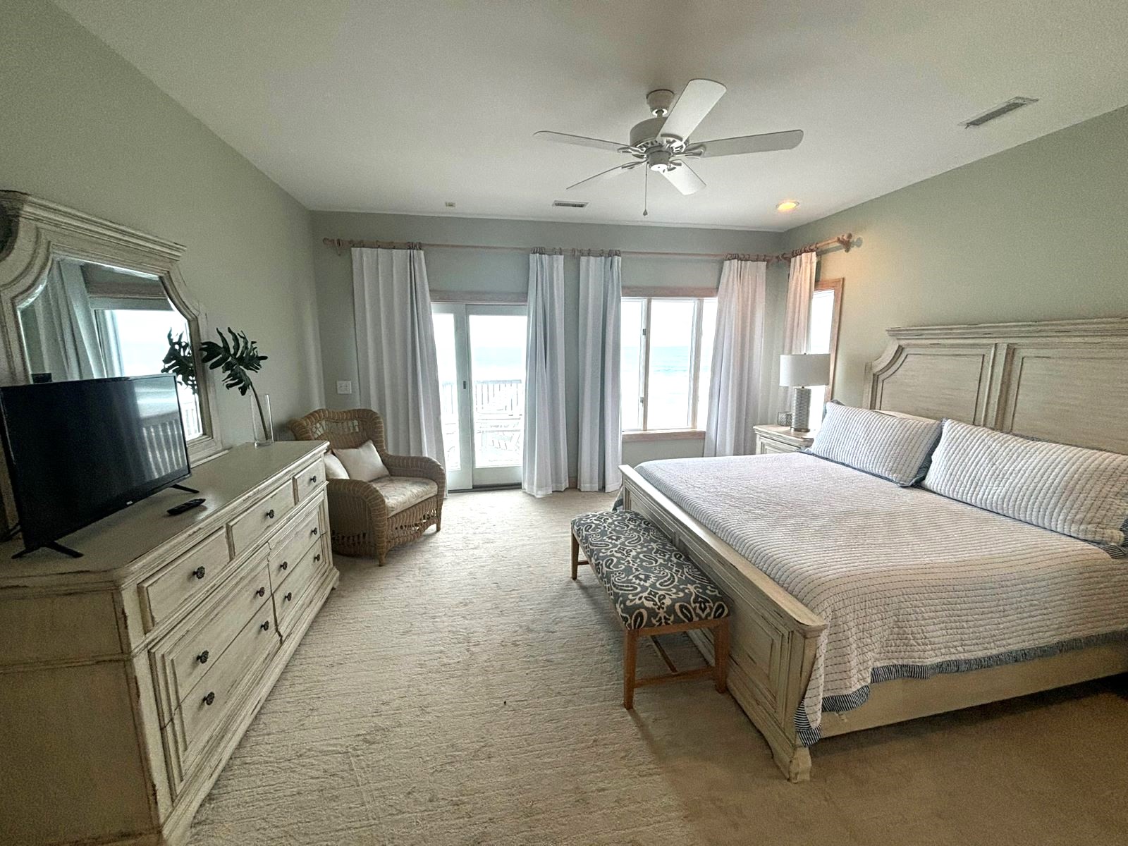 4BR/4.5BA Ocean Front. Upper level has open living, dining, kitchen, half bath and master bedroom (King) with private bath. Lower level has 3 bedrooms (King) with private bath (Queen and triple bunk, King) that share Bath. This level also offers a bonus room with a King bed and bath. Maximum 10Amenities